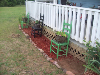 After we'd had our back porch for a few years it felt like it was past time to make it looked finished. What it needed was a flower bed. I had bags of mulch given to me as a Mother's Day gift (I tend to request things like that). I had three old ladder back chairs that I bought at a dollar store 25 years ago. I had three wire baskets, an old burlap coffee bean sack and two cans of half used paint. I have a habit of collecting bricks and bigger rocks when I see them on the side of the road. These were stacked on the front patio... Just see what I did with all those odds and ends!